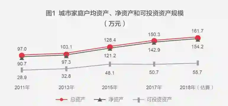 2018年,我国城市家庭的户均总资产规模为161.7万元,户均净资产规模为154.2万元,户均可投资资产规模为55.7万元。中国家庭财富逐年增加,财富总值已位列世界第二位。