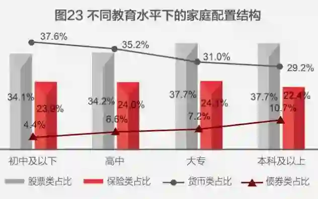 低学历水平的家庭,货币类产品配置明显高于其它学历水平的家庭,而债券和股票的占比则明显低于其它学历水平的家庭。