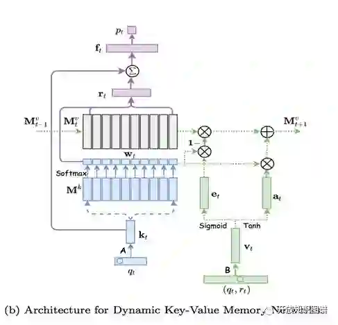 由于在线学习课程的兴起,学习者在课程学习过程中有很多习题练习的记录,利用这些记录,知识追踪(Knowledge Tracing)希望通过对学习者过往练习的结果分析其当前对一些概念的掌握程度。知识追踪任务可以形式化为一个有监督的序列学习问题:即给定学习者过去的练习记录 X = {x1, x2,...,xt-1},预测学习者对一个新的练习回答正确的概率,即:p(rt =1|qt,X)。典型的知识追踪方法有:Bayesian Knowledge Tracing(BKT) 和 Deep Knowledge Tracing(DKT). 在第一种 Bayesian Knowledge Tracing 中,学习者的知识状态st由知识概念集合{sti}表示,每个知识概念(concept state)为二元取值,表示 known 和 unknown,然后用隐马尔可夫模型更新知识概念状态的后验分布。BKT的不足有两方面:1)由于每个知识概念是单独表示的,BKT无法捕捉不同概念之间的相关性。2)BKT模型可以输出学习者对于预定义的学习概念的掌握情况,但是无法捕捉未定义的概念。3)BKT 用简单的转换模型来描述学习者对于不同概念的掌握情况,这就导致了 BKT 无法有效表示复杂的概念状态转换。第二种方法 Deep Knowledge Tracing, 运用了典型的 RNN 模型 LSTM,LSTM 用高维连续的向量空间表示S来模拟知识状态,输入和状态(input-to-state),状态和状态(state-to-state)之间的非线性转换使得DKT的表达能力比BKT更强,同时不需要人工对知识概念的标注,但是DKT将学习者当前对于所有概念的掌握情况用一个隐藏状态(hidden state)表示,这导致了DKT无法输出学习者对于具体概念的掌握情况。本文提出的 Dynamic Key-Value Memory Networks(DKVMN)模型借鉴了 MANN(memory-augmented neural networks),但是不像传统的MANN模型用单个记忆矩阵(memory matrix)或者两个静态记忆矩阵(static memory matrices),DKVMN 用一个静态矩阵 key 存贮所有的知识概念(knowledge concept)和一个动态的矩阵 value 存储以及更新学习者对于概念的掌握程度。DKVMN模型在追踪不同概念的掌握状态的同时能捕捉不同概念之间的关系。它对每个知识概念维护了一个概念状态(concept state),并且会自动学习当前的练习输入和各个知识概念之间的相关关系,当一个新的练习输入,DKVMN 会先选择和当前练习相关的知识概念,然后根据学习者的回答的正误情况更新相关知识概念的状态。DKVMN 的模型如下图所示。
