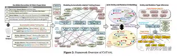 这篇文章是来自伊利诺香宾大学(UIUC)的工作,关注于文本中的实体和关系抽取研究,本文提出的 CoType 框架利用知识库作为实体和关系抽取任务的远程监督,并且同时完成抽取实体的类别识别,CoType 可以利用远程监督方法克服了传统抽取方式需要人工标注样本的弱点。CoType 主要包含以下四个步骤:1)自动标注文本中的实体(Entity mention detection),这一步利用知识库中已有的实体作为正样本,通过分析这些正样本文本的词序以及 POS 标记,并用两个随机森林分类器抽取出文本相关的特征,最后最大化定义的 mention 概率。2)自动标注文本中的关系(Relation mention generation),以第一步提取的文本中的标注实体为基础,用知识库作远程监督,标注一个句子中含有的所有标注实体对的对应关系。3)将一二步生成的实体和关系标注作为样本,结合文本特征将实体和关系用一个低维向量表示,向量表示的前提假设有两个:一个是如果两个标注实体的周围文本特征(context)越相似,则它们的向量表示越近似;另一个是标注关系的向量表示要尽量和它最近似的关系类别的表示相近。除了文本特征,为了捕捉实体和关系表示之间的关系,CoType 采用 TransE 的假设,对于一个正确的三元组标注(m1,z,m2),||m1+z-m2||^2 要尽可能小,而对于错误的三元组值要尽可能大,所以最后设置了基于最大间隔的损失函数来约束实体和关系的向量表示。由于CoType整个模型的目标函数包含了三个部分:实体标注的目标函数 O_M,关系标注的目标函数 O_Z,实体和关系之间的关系的目标函数 O_ZM,CoType 提出了 a stochastic sub-gradient descent algorithm 来优化求解目标函数。在三个数据集上测试的实体识别和分类任务以及关系分类任务中 CoType 相比于以前的方法都有所提升。CoType 的整体框架和处理流程如下图所示: