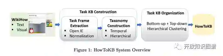 这篇文章提出了一个很有意思的问题:在搜索引擎中有大量用户在搜索问题解决型的信息,例如如何修自行车,但是作为搜索引擎中日益重要的知识库却缺乏这类问题解决型(How-to)的知识。WikiHow 是一个专注于解决“怎么做”问题的网站,作者基于 WikiHow 最终构建了一个专门包含问题解决型知识的知识库 HowToKB。HowToKB 的主要构建步骤有:1)通过 OpenIE 4.2 软件从 WikiHow 网站的文本中抽取三元组。2)组织 Task KB,主要包含两个任务,一个是WikiHow内容的去重和聚类,例如任务 paint a wall 和 color aceiling 有很大相似性。另一个是任务之间的消歧,例如任务 use a keyboard 可能是 use a music keyboard 也可能是 use acomputer keyboard。首先计算三种相似度:Categorical similarity、Lexical similarity 和 Vector similarity,将三种相似度当作特征生成最种两种任务(task)之间的相似度,然后采用层次聚类算法对任务进行聚类。HowToKB最终包含了去歧后的任务层次分类,每个任务的子任务顺序以及完成这个任务所需要的工具。在关于知识库构建和知识库组织方面的测评中,HowToKB 都有较高的准确率。作者最后还测试了一个 use case:自动搜索和 HowToKB 中的任务相关的 Youtube 视频。HowToKB 的构建过程如下图: