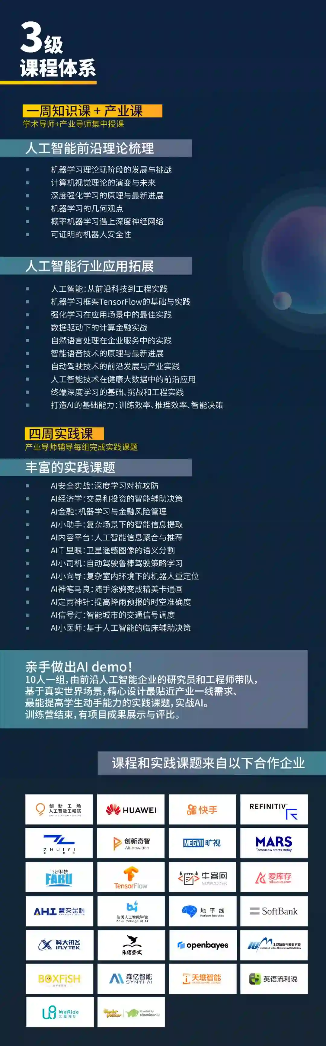 通过「1 周理论知识+4 周项目实践」的形式,一方面瞄准国际前沿科技方向,邀请学术大师讲授最先进的教学理念;另一方面从产业需求出发,强调项目实践在 AI 教学中的重要作用,课题由合作企业基于真实世界场景精心设计,使用来自工业界的真实数据或案例,帮助学生接触第一手的产业信息,完成自己的 AI 项目成果,迅速成长为产业人才。