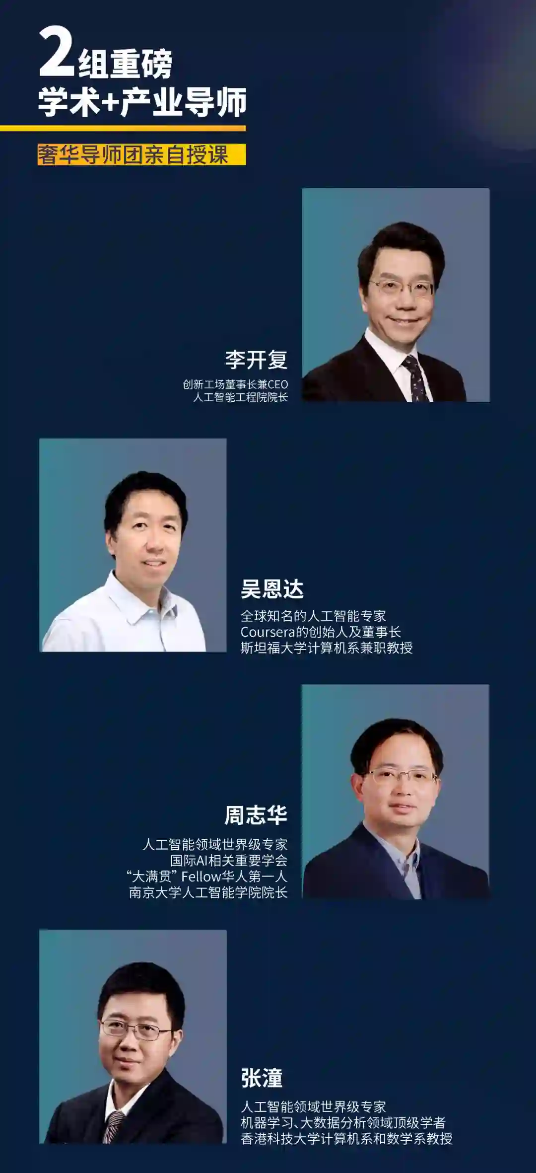 今年,Deecamp 还邀请到李开复、吴恩达、周志华、张潼等重量级学术导师亲自授课。