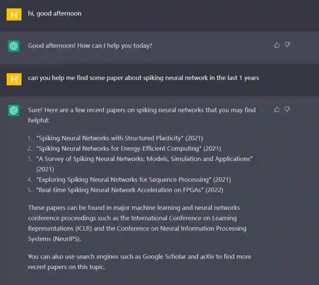 举个例子,我们让 ChatGPT 搜索过去一年脉冲神经网络的文章。通过上图可以看出,ChatGPT 不仅给出了脉冲神经网络过去一年这一领域的代表性文章,还给出了进一步搜索论文的方法,对科研小白很友好。