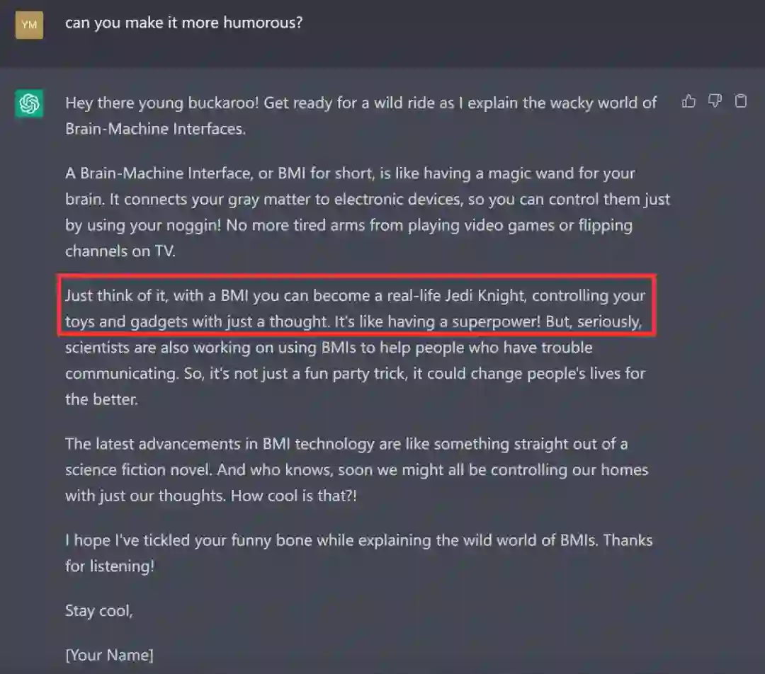 在新的回复中,ChatGPT 给出了一个比喻,把脑机接口加持的人类比喻成绝地武士(Jedi Knight),《星球大战》里银河共和国的保卫者,更加符合小朋友的想象力。