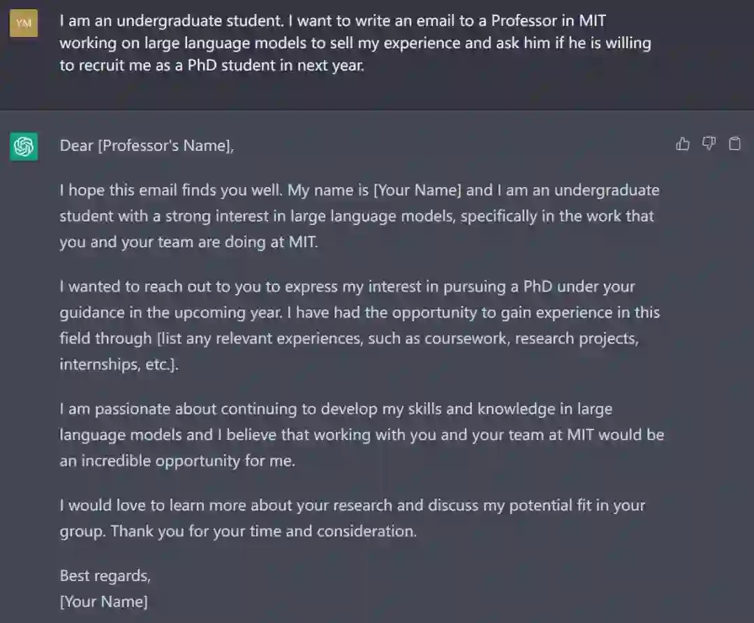 总的来说,学术圈内的邮件沟通,尤其是英文邮件,ChatGPT 都能起到重要的辅助作用,下面举几个例子。