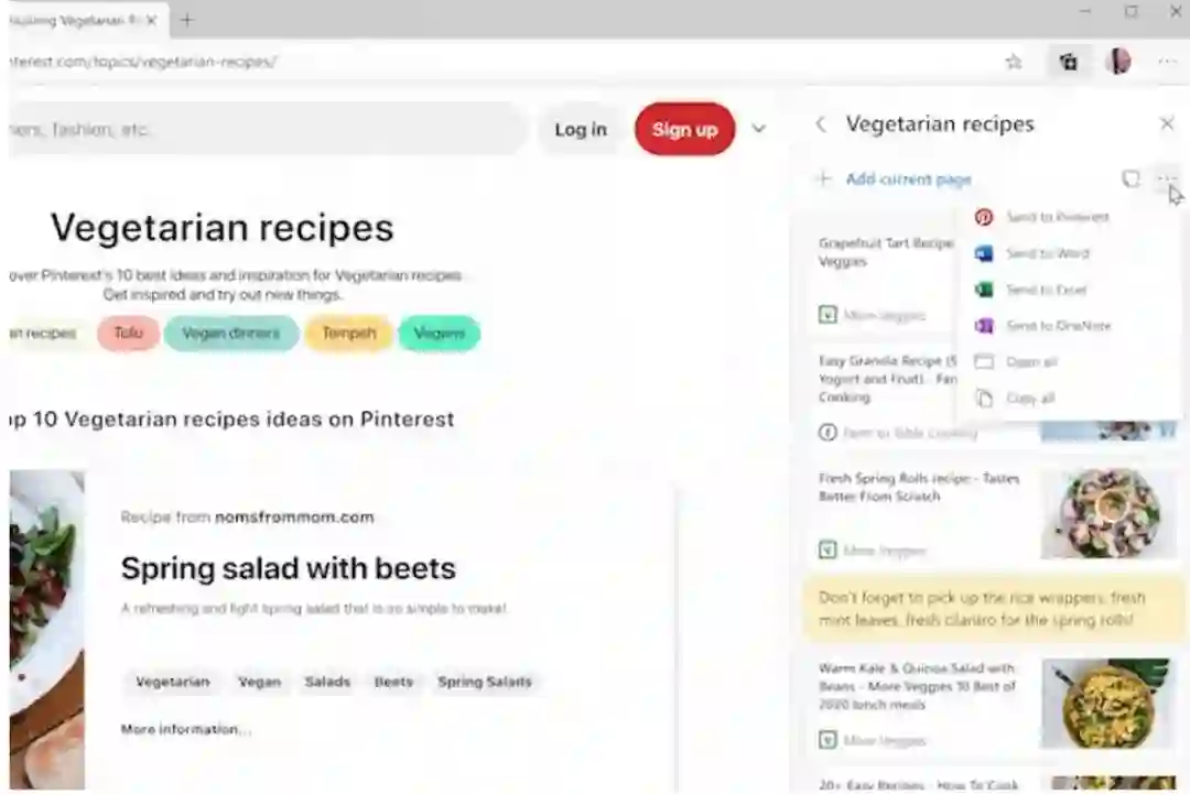 集锦支持 Pinterest 和 OneNote:集锦是 Edge 内置的一个用来进行网页剪藏的工具,可以用来收集 URL 页面、图片或文本等信息,并统一进行保存。微软这次为它带来了导出到 Pinterest 和 OneNote 的支持。