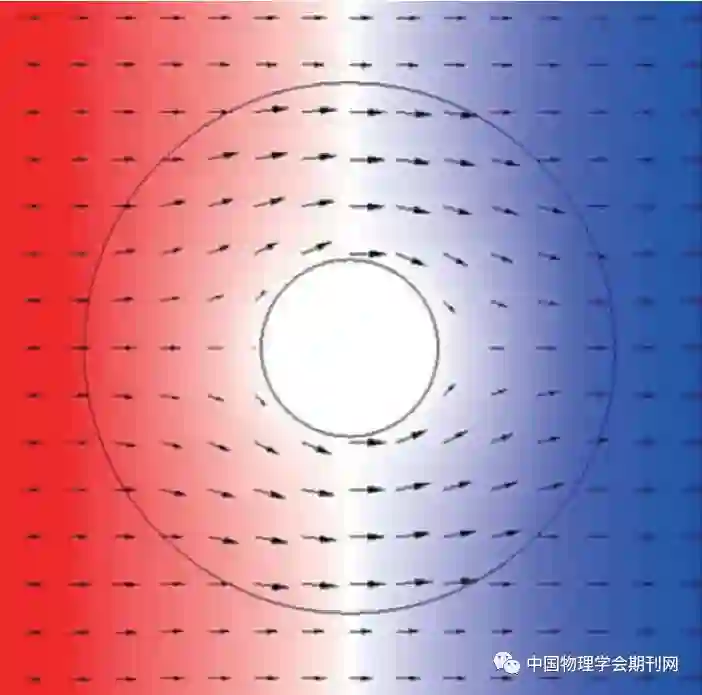 图1 热隐身斗篷温度分布的有限元模拟结果。此图呈现两个特点:(1)内圈里面温度均匀分布;(2)外圈之外的温度分布不受内外圈之间材料的影响。这两个特点直接导致,当内圈里存放一个不同物体,外圈外面的观察者将无法通过探测外圈外面的温度分布而推知内圈里物体的存在(图中左右边界分别与高温热源和低温热源相连,颜色代表温度分布;图中箭头表示热流的大小和方向)