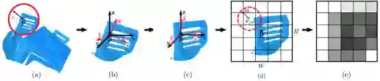 图2 输入参数:(a)利用(b)中计算出的LRF来提取兴趣点p周边的球状区域S;(c)每个数据立方体都转化为其标准的表示形式;(d)使用高斯平滑核进行体素化;(e)标准化后的3D SDV体素网格作为3DSmoothNet的输入。
