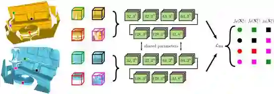 图3 3DSmoothNet的网络架构:我们先在两个片段的重叠区域中提取兴趣点。再以兴趣点为中心,得到每个兴趣点对应的立方体贴片(边界框用感兴趣点进行颜色编码),这些立方体贴片都与计算出来的LRF估计值对齐,并被转换为SDV体素网格,最终作为网络的输入。3DSmoothNet由卷积(绿色矩形),批标准化(橙色),ReLU激活函数(蓝色)和L2范数(品红)层组成。两个分支共享所有的参数。