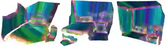 图4 3DSmoothNet描述子是具有几何信息的:通过PCA方法嵌入到3D空间(前三个组件通过RGB颜色编码)。平面区域位于蓝绿色光谱、橙色-粉红色光谱的边缘和角落,球形表面位于黄色光谱中。