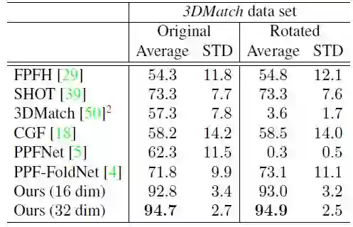 表1 3DMatch和3DRotatedMatch数据的结果。该表格展示了所有场景的平均召回率以及每种方法的标准偏差(STD),效果最好的用粗体显示。