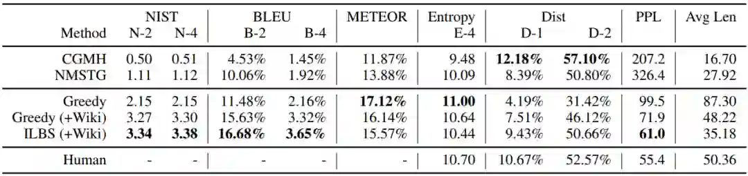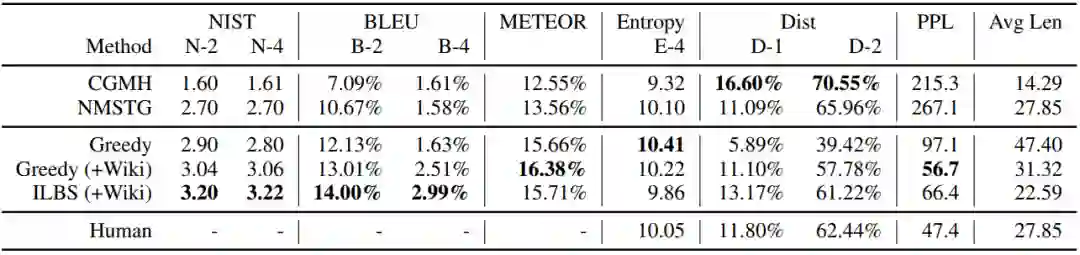 下面两个表分别是在News和Yelp上的实验结果,可以看到,在NIST、BLEU、METEOR、PPL得分上,POINTER相比基线模型取得了显著的提升,而Dist评估的是模型生成的多样性,且基线模型CGMH和NMSTG是基于采样的方法,自然在Dist得分上也就比POINTER高。