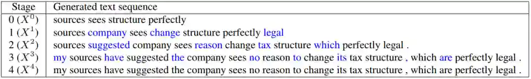 下图是硬约束插入式非自回归生成的一个例子。给定的关键信息是,经过4次迭代,每次迭代新插入的词为蓝色,模型最终生成了期望的句子