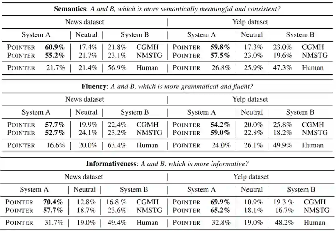 下表是人工测评的结果。在语义度、流畅度和信息度上,POINTER都显著好于基线模型,但仍然和人工写作的文本有所差异。