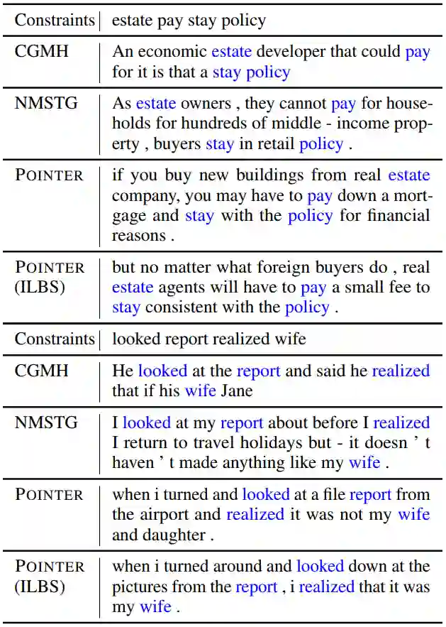 下图是数据集Yelp上的两个具体例子。和基线模型相比,POINTER生成的句子不但考虑了所有的硬约束,并且句子更加通顺流畅,也更加符合硬约束的原义。