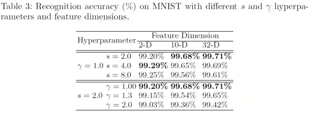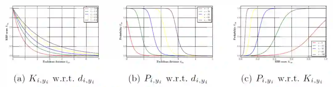 图3(a)中,当γ变大的时候,RBF-score也会变大,样本及其对应的prototype的相似度也会变大,优化任务变得简单。图3(b)(c)显示了不同的s下将欧式距离和RBF-score映射到概率的表现。s控制了概率的范围以及分类任务的难易程度:对于固定的欧式距离和RBF-score,小的s导致了概率的狭窄的范围,使得分类任务变得困难。从梯度的角度也能得到相似的结论,RBF-score和s决定了梯度的大小。