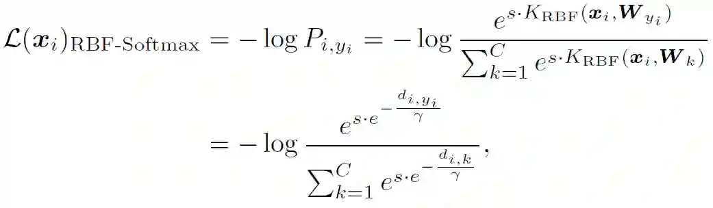 其中,dij是xi和wj之间的欧式距离,γ是超参数。相比于无界的內积和欧式距离,RBF-score在欧式距离变大的时候会衰减,其值域是0到1,RBF-score很好的度量了xi和wj之间的相似度,可以用作softmax中的logit。我们这样定义RBF-Softmax: