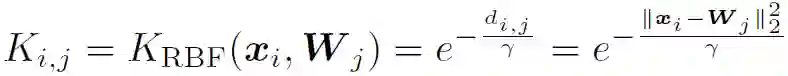 为了解决上面的两个问题,我们提出了一个距离,叫做Radial Basis Function kernel distance(RBF-score),用来度量xi和Wj之间的相似度: