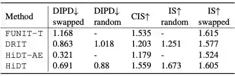 ,在定性对比上,得到的结果如图 5 所示,从左到右对应的是原始图像、FUNIT-T、FUNIT-O、HiDT。