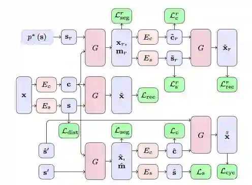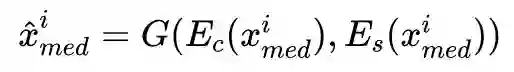 在训练阶段是由目标域图像编码得到,在测试阶段则是通过在先验分布下采样得到,这部分我们待会再详细讨论。