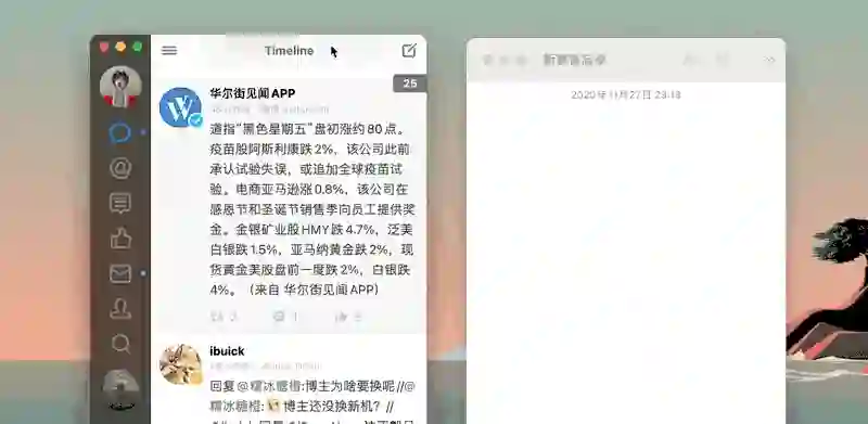 支持 Force Touch 按压操作,可以快速查看微博话题或者外链内容,省去了大量来回跳转甚至调用浏览器的步骤,再次印证在 macOS 里,触摸板还是要比鼠标舒服的多。