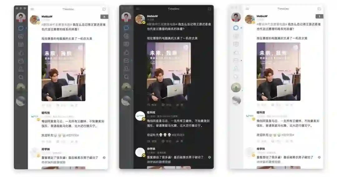 新浪微博官方也曾经尝试过桌面客户端,像微博 Air、微博桌面以及 UWP 版微博,但最终还是全面放弃。客观来说,我或许能够有一点理解这样的做法:像微博、Twitter这种社交平台,并非以聊天为核心,基于网页端反而能够获取更加完善的功能体验。近期,新版的微博首页也已经开始大面积公测,提供了一些新鲜感以及体验上的优化。