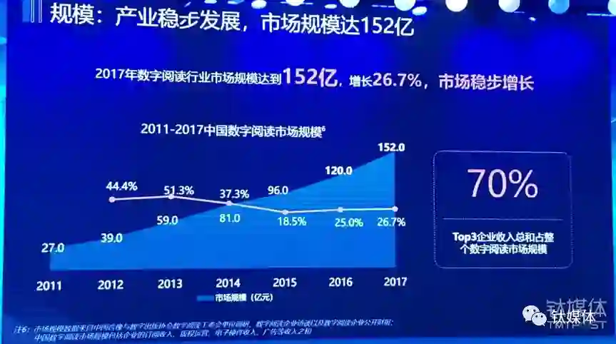 日前,据中国音像与数字出版协会发布的《2017年度中国数字阅读白皮书》(以下称《白皮书》)显示,2017年中国数字阅读行业市场规模达到152亿元,增长了26.7%。