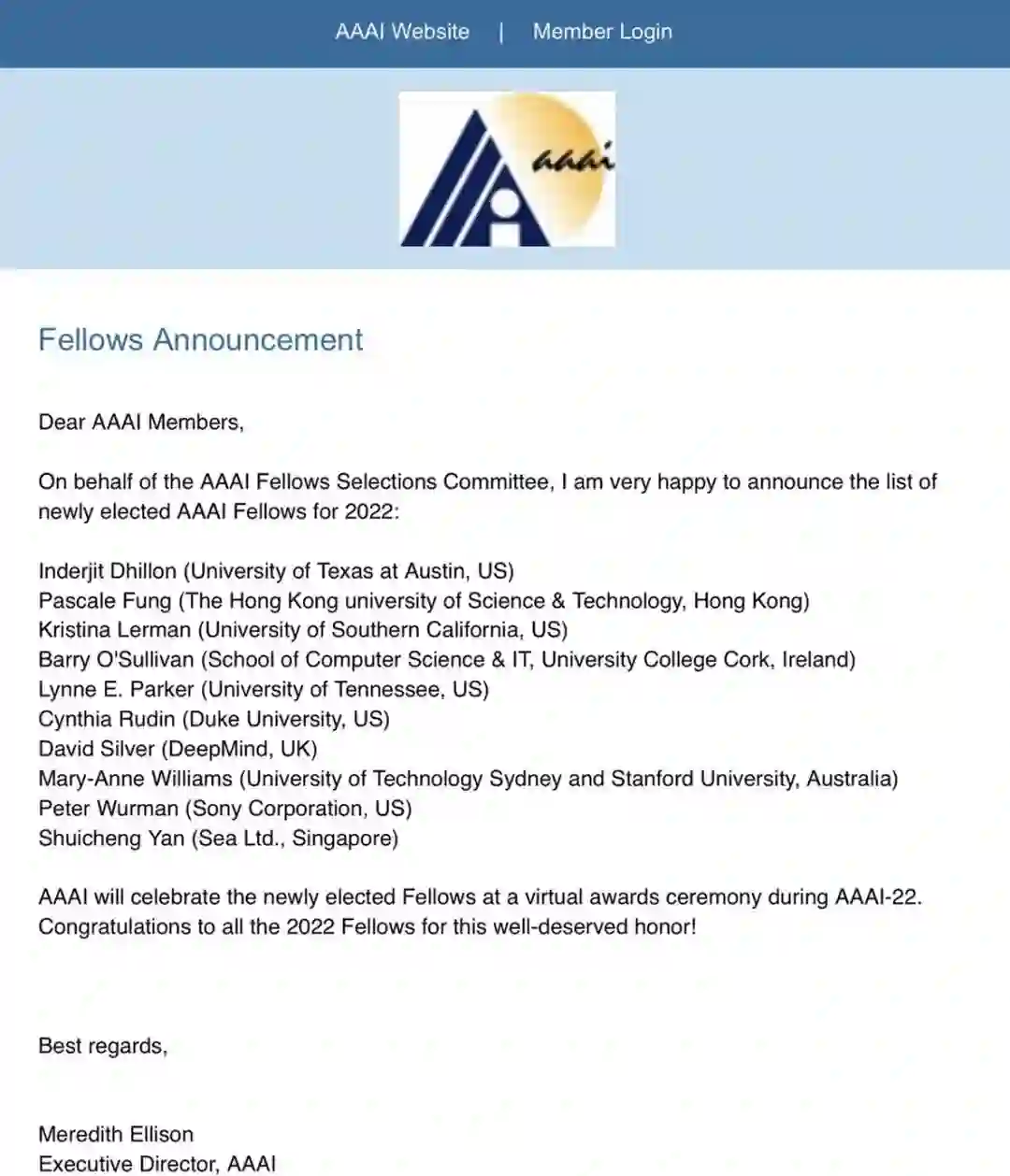 AAAI(Association for the Advancement of Artificial Intelligence)是国际人工智能领域最权威的学术组织,Fellow 是该学会给予会员的最高荣誉,仅颁给对人工智能做出「非同寻常的卓越贡献者」,而且评价时间以十年计。由于其评判极严格,历届 AAAI Fellow 入选者均为人工智能领域公认的著名学者,每年严格限制不超过 10 位(通常是 5 位)入选,因此被誉为国际人工智能领域的名人堂。