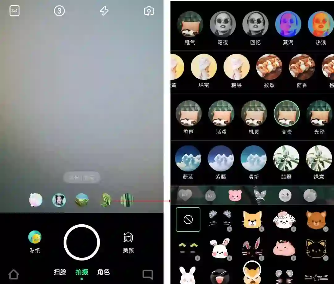 App相机会智能识别人物、食物、风景、动物等不同情景,并且自动为用户美颜,智能推荐滤镜和贴纸,增加照片的美观度,满足用户爱美的心理。