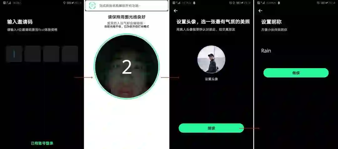 输入邀请码→刷脸认证→设置头像→设置昵称