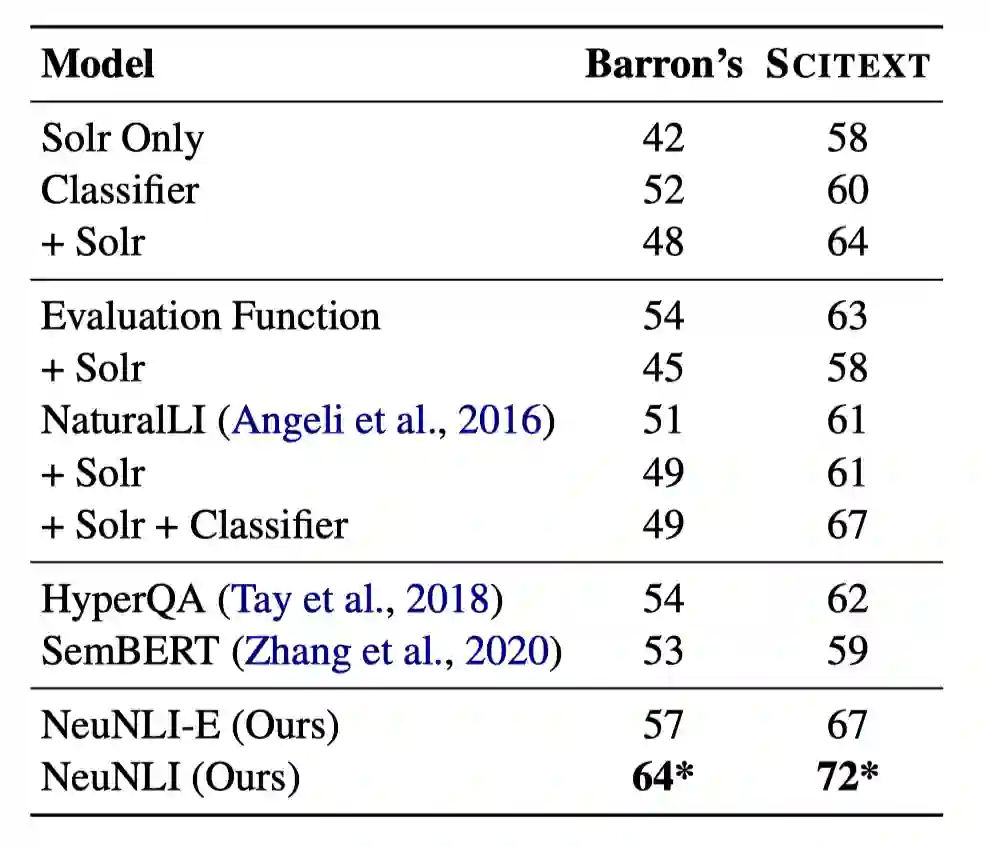 该研究点在两个公开的数据集[1]上评估模型的性能。这两个数据集由New York Regents 4年级科学考试中的非图表式选择题组成。其中一个数据集(QA-S)由训练集的108个例子、验证集的61个例子和测试集的68个例子组成。另一个数据集(QA-L)规模较大,训练集、验证集和测试集分别有500个例子、249个例子和250个例子。两个外部知识库,一个是Barron学习指南,由1200个句子组成。另一个是Scitext语料库,其中除了包含Barron学习指南,还包含维基百科、字典和科学类教科书,共1,316,278句话。
