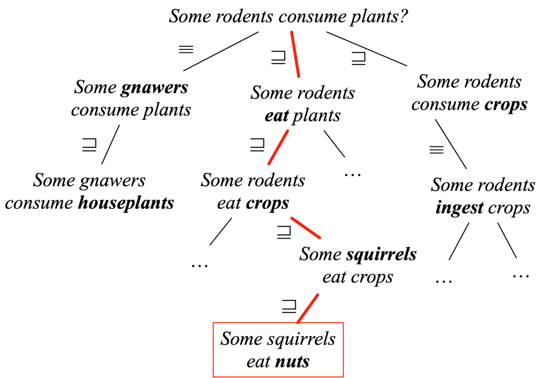 图1 自然逻辑证明过程,该过程从一个假设“some rodents consume plants”开始,推理找到了一个前提“some squirrels eat nuts”,边上的标签展示了相连的两个句子之间的逻辑关系