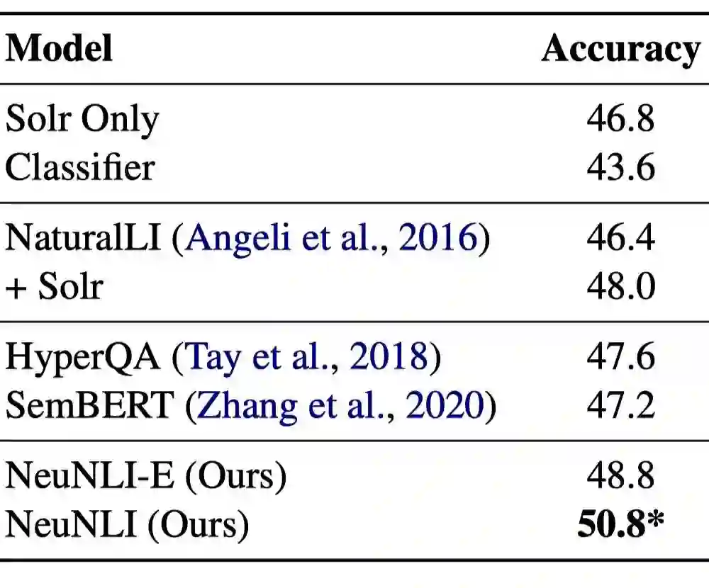 我们在表3(QA-S)和表4(QA-L)中分别列出了基线方法以及NeuNLI在两个测试集上的准确率。在表3中,同时列出利用两个不同知识库的实验结果。