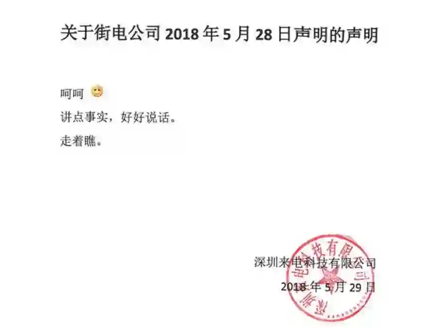 昨天,来电科技针对街电的声明再发布声明称 :“ 呵呵,讲点事实,好好说话。走着瞧 ”。指责街电的声明不顾事实。