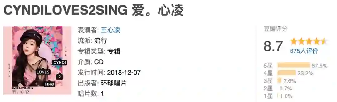 2018年她发行的新专辑《CYNDILOVES2SING》,在发行不到一个月的时间内,斩获当年的华语五大金榜销量女冠,豆瓣评分8.7分。