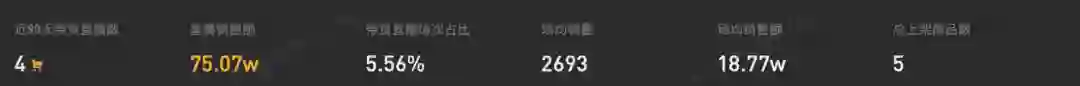根据新抖数据,近90天里,他在直播间上架了四个品牌的产品,分别为九阳豆浆、王饱饱、永璞咖啡和倍优禾,总预估销售额为75.07万。