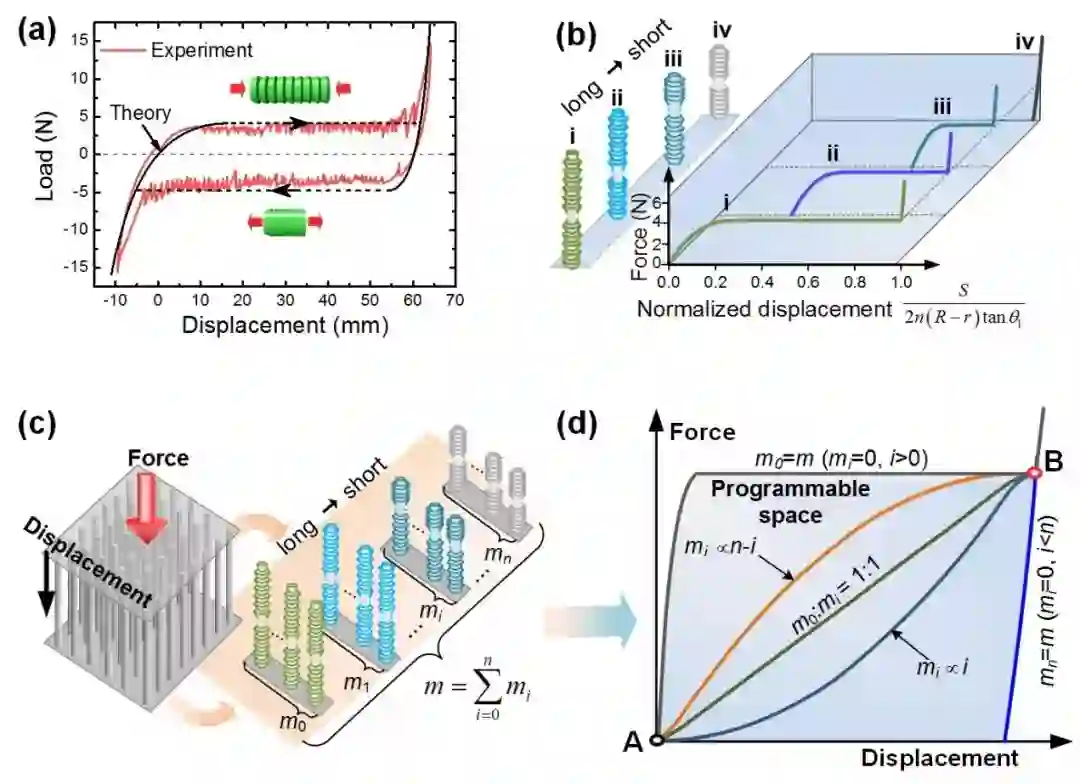 图2. 三维像素超材料的力学行为:(a) 多稳态机械像素的力-位移曲线:具有滞回环;(b) 通过改变机械像素初始长度调节力-位移曲线;(c) 通过设计机械像素阵列的高度分布实现整体力学性能编程;(d) 超材料力-位移曲线的编程空间