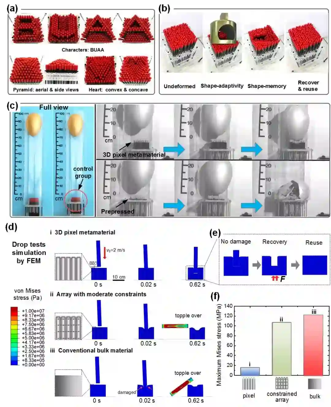 图3. 三维像素力学超材料的形状可重构性和抗冲击性:(a) 超材料上可重构的稳定三维形貌:可形成具有局部大剪切应变的形貌;(b) 超材料具有形状适应性和记忆性,能快速恢复并重复使用;(c) “金蛋”跌落对比实验:超材料可以有效保护金蛋跌落不破碎;(d) 有限元模拟对比表明:相对块体材料和受约束的阵列材料,三维像素超材料具有更好的冲击防护能力,可以平稳接住细长物体;(e) 三维像素超材料在冲击过程中不产生破坏,并且能重复利用;(f) 用三维像素超材料防护的物体冲击应力最小。