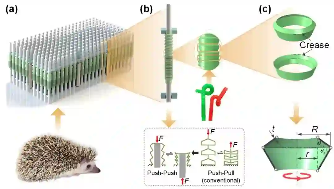 图1. 三维像素力学超材料设计方案图:(a) 受刺猬背刺排列形式启发的阵列化材料设计;(b) 受吸管启发的多稳态机械像素;(c) 具有双稳态的基本单元