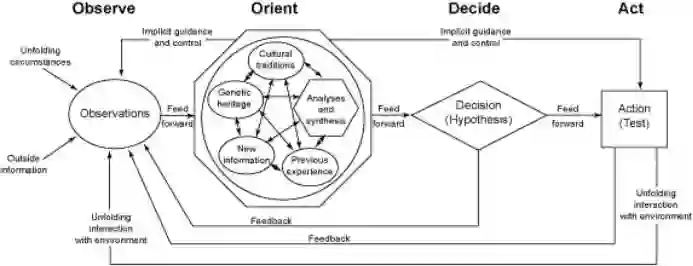 在1973年参与以色列战争时,美国已经意识到,战争在瞬间内取得胜利是有可能的。时任美国陆军训练与条令司令部的司令员威廉姆·德普伊将一些关于战争进化的重要思想记入了战地手册FM100-5中,不久之后一位特殊的改革者对这一战争进化理论产生了巨大的影响:约翰·博伊德。博伊德将自己驾驶轰炸机进行战斗的思想进行了超浓缩精炼,最后提出了我们现在熟知的OODA循环理论。OODA代表“观察(Observe)、调整(Orient)、决策(Decide)、行动(Act)”。这一闭环反馈模型随后被写入了1982年的FM100-5手册。为了抢占先机,攻击者必须首先看到机会,决定下一步行动,并且要比敌人更加快速的执行,然后不断重复这一过程。至此,整个军队都通过一个闭环反馈来进行周期性的运转了,这就是我们今天的“空地一体战”的雏形。