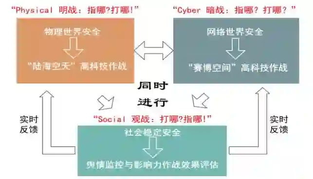 跨域作战的主要表现是以无人武器为核心的“明战”、以网络武器为主导的“暗战”,及以社会媒体为手段的“观战”之有机战略组合。
