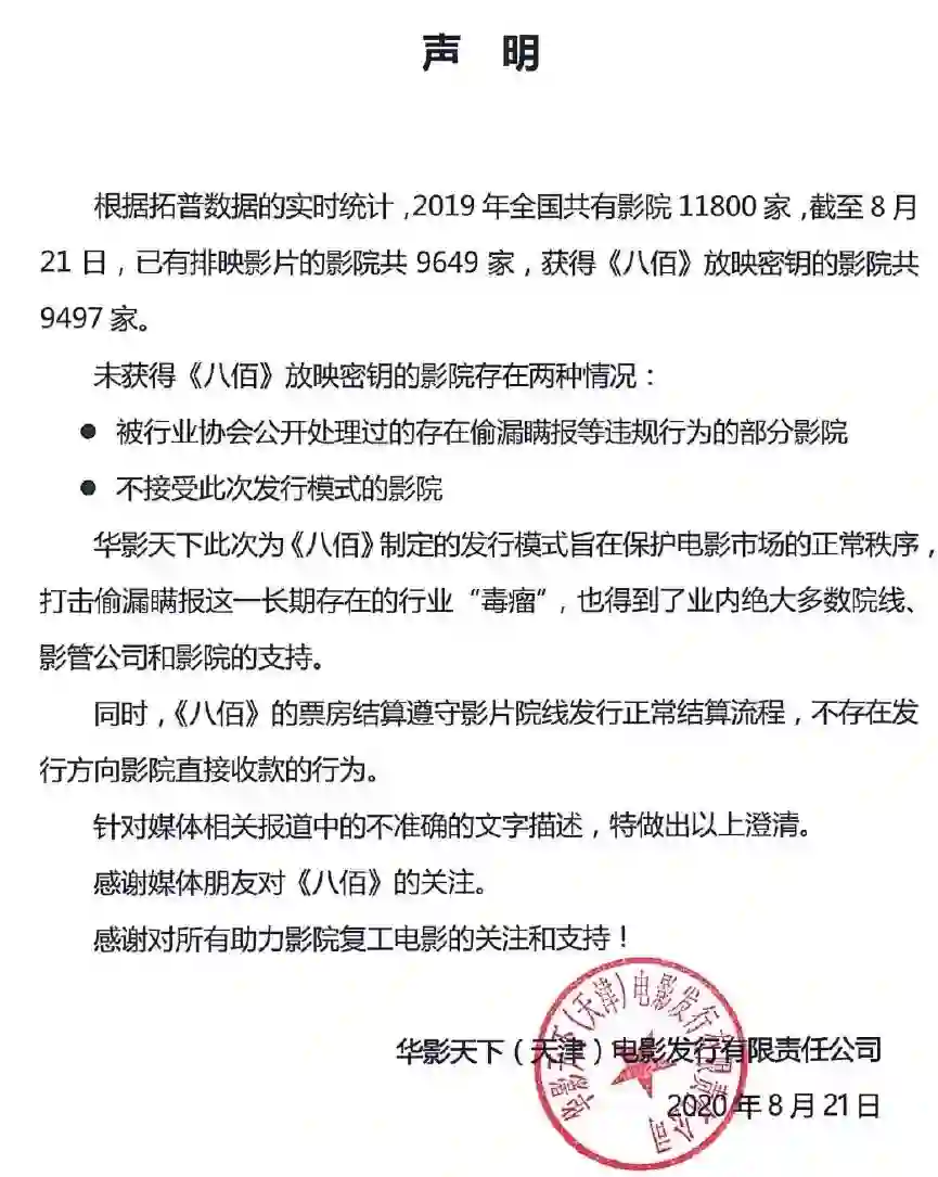 声明还指出,未获得《八佰》放映密钥的影院存在两种情况:被行业协会公开处理过的存在偷漏瞒报等违规行为的部分影院;不接受此次发行模式的影院。