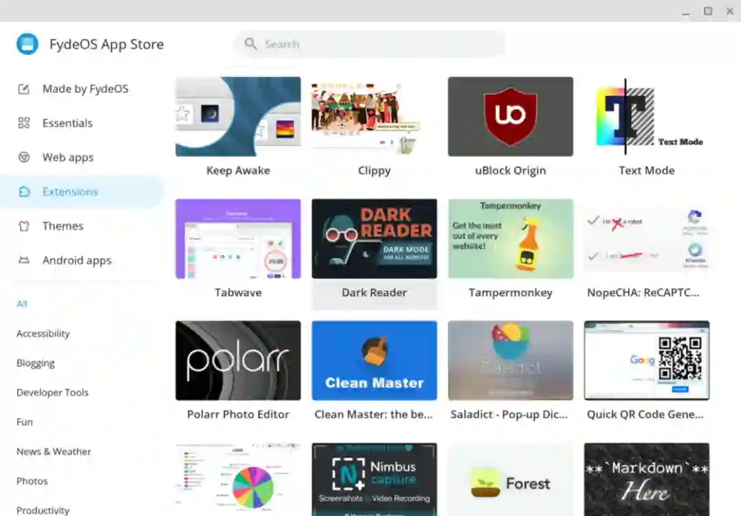 除此之外,FydeOS 还内置了一个应用商店来代替 Google 的 Chrome Web Store 和 Google Play Store,包括他们挑选过的一些经过测试、可在大屏上施展的 Android 应用,值得推荐的 Chrome 浏览器拓展、主题以及相关的网络应用,以及出自 FydeOS 团队的 OneDirve/坚果云应用供用户挂载云存储。这个应用商店对于发烧友来说似乎有些多余(当然逛逛并不会失去什么),对于普通用户来说绝对是进入系统后首先会打开的对象,算是撞入小众系统后的安心落地。这个应用商店也并非唯一选择,依然可以使用 Google 的 Web Store 获取最完整的拓展生态,或使用内置的 Open Gapps 工具打开 Play Store 生态的大门。