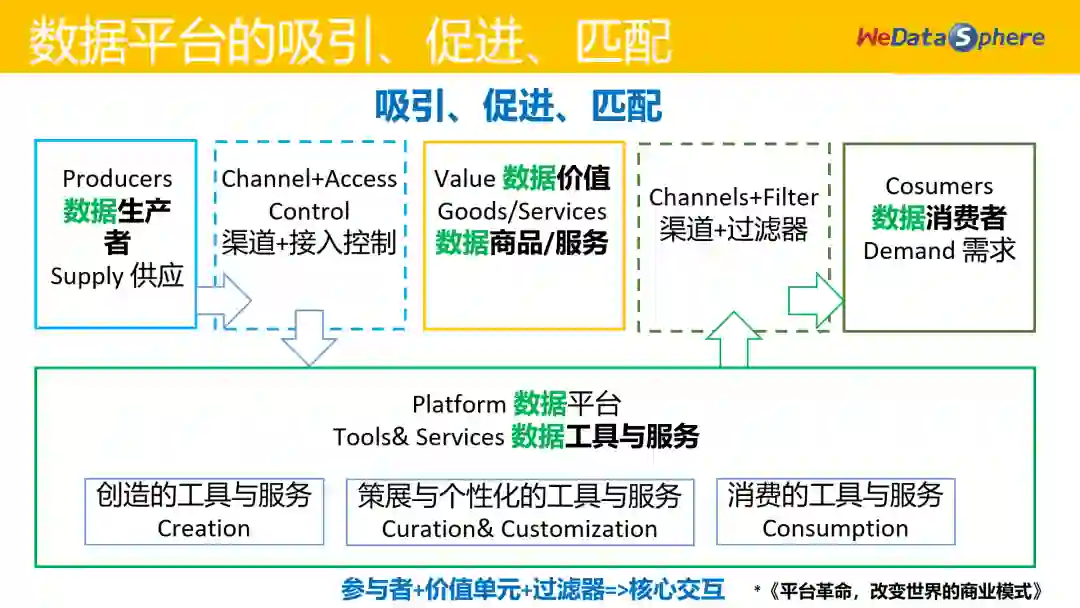 那么,企业如何建设数据平台?借用《平台革命》一书,平台最核心的价值是促成很多最核心的交互,即“参与者 + 价值单元 + 过滤器 =>核心交互”。而最能体现平台价值的能力是吸引、促进和匹配。在数据领域,问题在于怎样提供更好的数据工具和服务,促使数据平台完成吸引、促进和匹配。