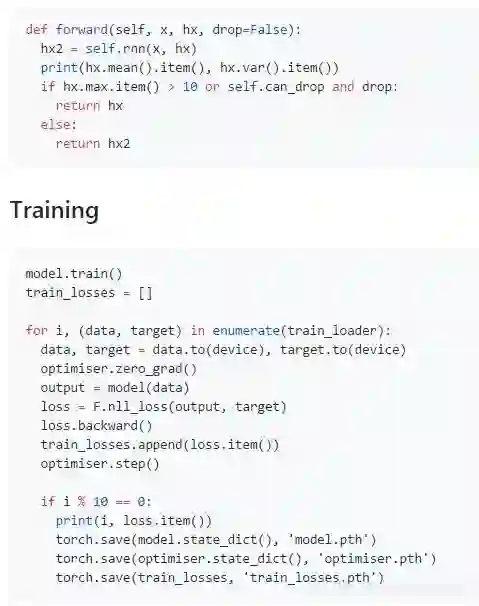 这里没有指出的一些要点是,正向传递可以使用控制流,例如,成员变量,或者甚至数据本身可以决定if语句的执行。在中间打印出张量也是非常有效的,这会使调试变得更加容易。最后,前向传递可以使用多个参数。用一个简短的代码片段来说明这一点: