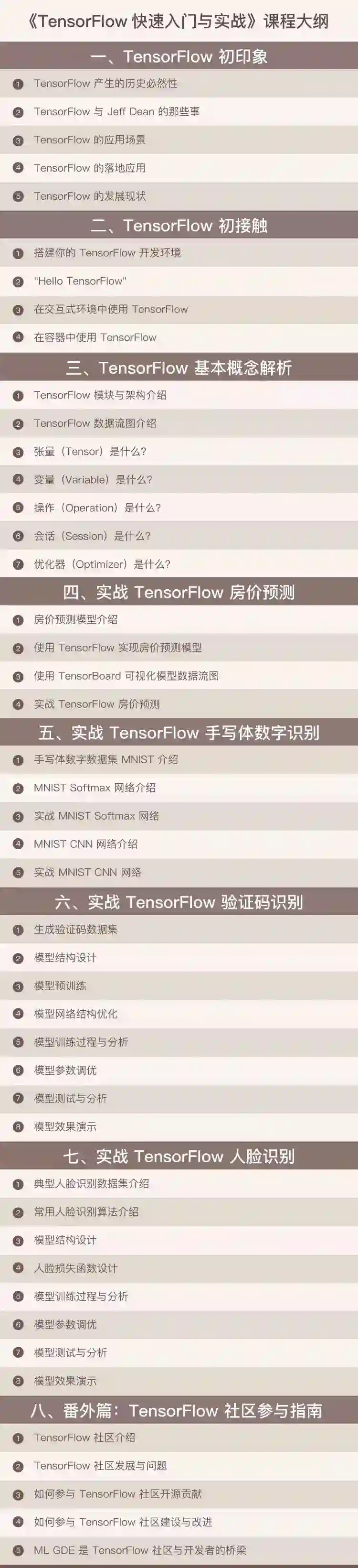 1. 课程从张量(Tensor)、变量(Variable)、操作(Operation)、会话(Session)、优化器(Optimizer)等 TensorFlow 基本概念讲起,帮你打牢基础,再进行下一步学习。