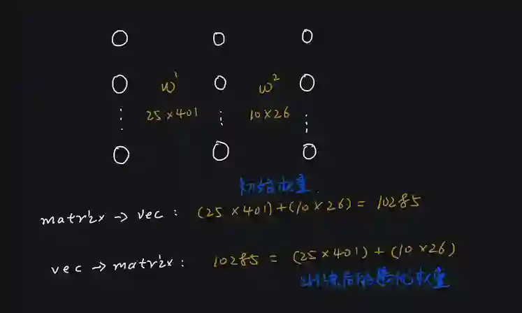 注意上面优化库的输入 X0 = init_theta 是一个向量,而我们的神经网络每 2 层之间就有一个权重矩阵,所以为了把权重矩阵作为优化库的输入,我们必须要把所有的权重参数都组合到一个向量中,也就是实现一个把矩阵组合到向量的功能。
