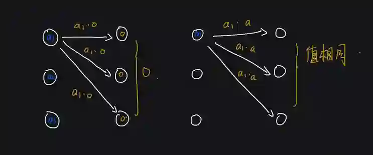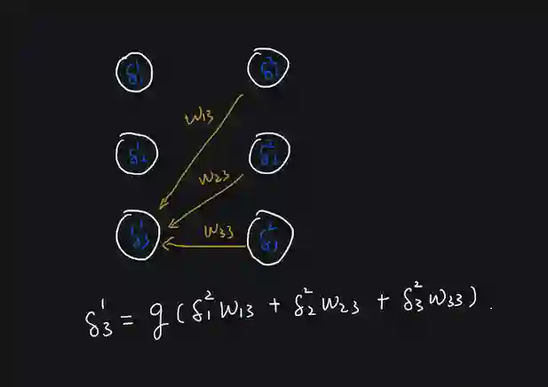 其实反向 BP 算法也是做类似的计算,一个激活单元误差的输入是后一层所有误差与权重的加权和(可能不包含偏置),只不过这里计算的反向是从右向左,计算的是每个激活单元的误差,对比看图:
