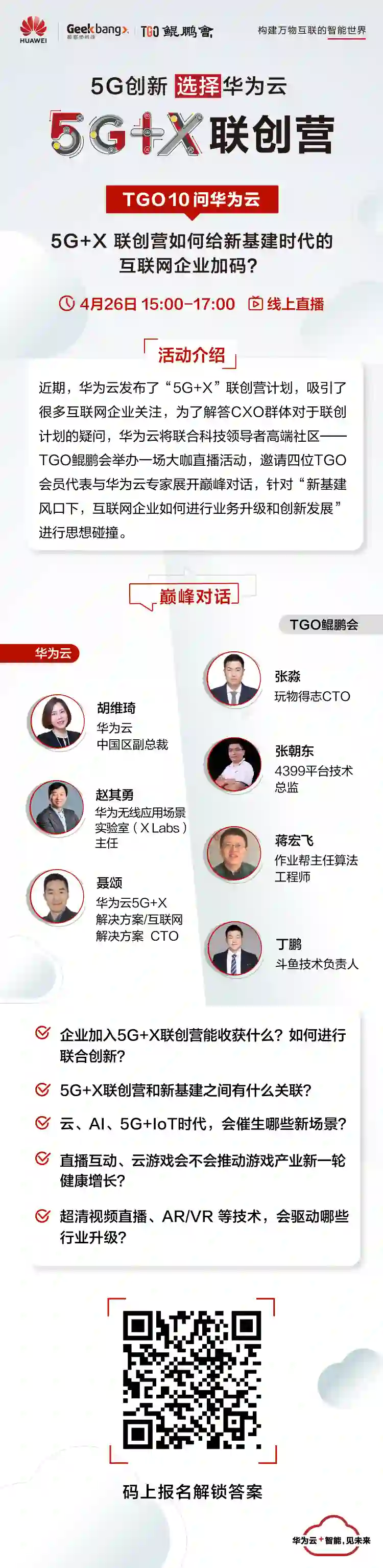 为了解答 CXO 群体对于联创计划的疑问,让大家更好地了解如何进行联创,同时也为了了解不同行业 CXO 关注哪些层面的合作,华为云“5G+X”联创营将在 4 月 26 日举办一场大咖直播活动,届时将会邀请到汇聚全球科技领导者的高端社区——TGO 鲲鹏会 4 位会员提问华为云专家,针对在线教育、音视频、智慧电商、游戏等领域的痛点和发展难点,寻找借力华为云的答案。
